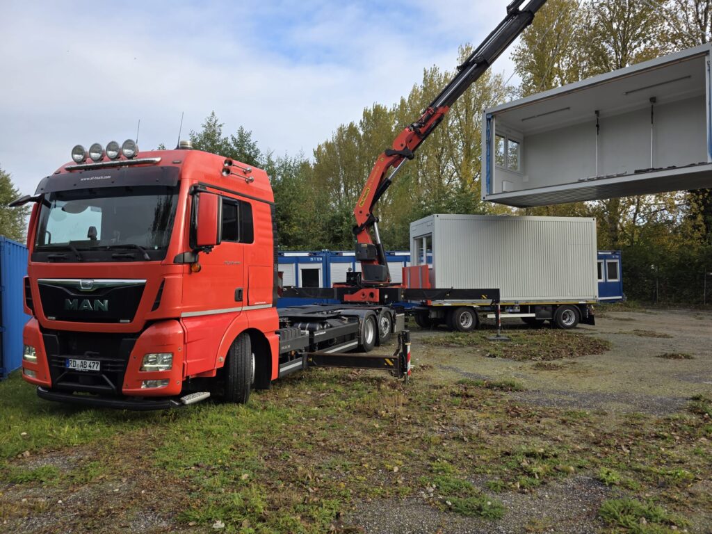Mit unserem MAN LKW inklusive leistungsstarkem Aufbaukran Palfinger 53002 SH, mit 16,5 Meter Auslage und 2,5 Tonnen Hubleistung auf der Spitze, übernehmen wir sichere und effiziente Krantransporte – zuverlässig und flexibel. Dank integrierter Ladefläche für 20-Fuß-Container sowie zusätzlichem Anhänger für einen weiteren 20-Fuß-Container bieten wir maßgeschneiderte Transportlösungen für schwere Lasten, Maschinen, Bau- und Containerlogistik.